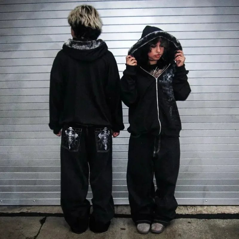 Gothic Rock Skeleton Bone Letter Pattern Oversized Jeans